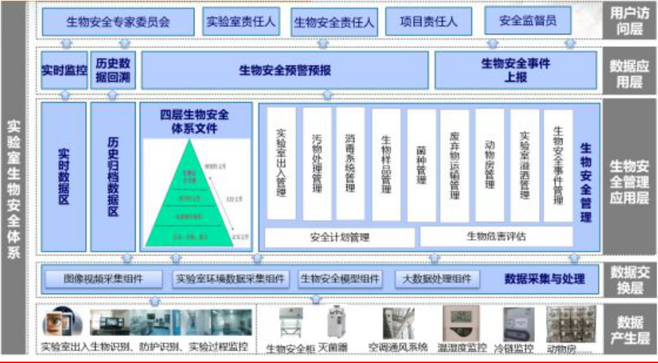 實驗室生物安全管理平臺充分利用圖像與視頻數據采集、物聯網、大數據處理、人工智能等信息化技術,為生物安全實驗室的生物安全提供了更加智能的管理方式。同時,生物安全管理平臺也為生物安全的各級主管單位、實驗室責任人等提供了實時、可視化的生物安全管理手段。