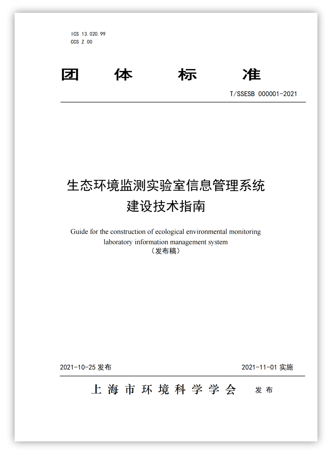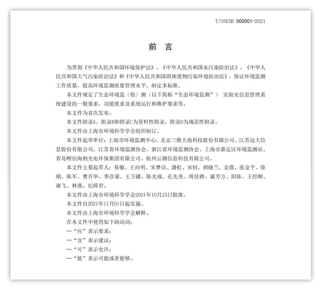10月25日,由上海市環(huán)境監(jiān)測中心、北京三維天地科技股份有限公司及江蘇、浙江省環(huán)境監(jiān)測協(xié)會等八家單位共同起草的《生態(tài)環(huán)境監(jiān)測實(shí)驗室信息管理系統(tǒng)建設(shè)技術(shù)指南》,經(jīng)上海市環(huán)境科學(xué)學(xué)會批準(zhǔn),將于2021年11月01日起正式實(shí)施。
