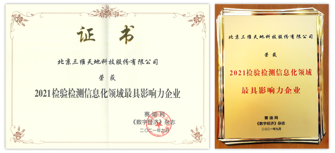 數智創新 | 三維天地蟬聯榮獲“2021檢驗檢測行業信息化最具影響力企業”