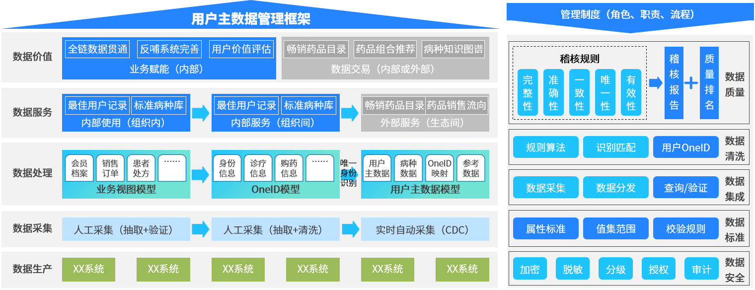 用戶主數(shù)據(jù)項目是該藥企數(shù)字化轉(zhuǎn)型基礎(chǔ)數(shù)據(jù)優(yōu)化階段的重要組成部分。制定數(shù)據(jù)管理制度、數(shù)據(jù)標準、優(yōu)化數(shù)據(jù)質(zhì)量、數(shù)據(jù)的安全合規(guī)使用是用戶主數(shù)據(jù)項目的主要目標,同時也是用戶主數(shù)據(jù)項目的核心。通過項目建設(shè),統(tǒng)一企業(yè)各C端業(yè)務(wù)系統(tǒng)中用戶數(shù)據(jù)標準,提升用戶數(shù)據(jù)質(zhì)量,在企業(yè)內(nèi)部安全合規(guī)地使用及管理用戶數(shù)據(jù),從而支撐業(yè)務(wù)經(jīng)營分析、輔助決策,發(fā)揮用戶數(shù)據(jù)價值,實現(xiàn)企業(yè)數(shù)字化轉(zhuǎn)型目標。
