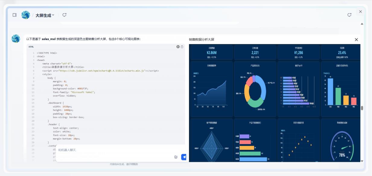 應用于數據分析大屏智能體,可根據用戶問題,調用數據計算分析工具,代碼生成工具,精準生成完整的數據大屏應用,大幅提升開發效率,使數據可視化開發更智能高效。