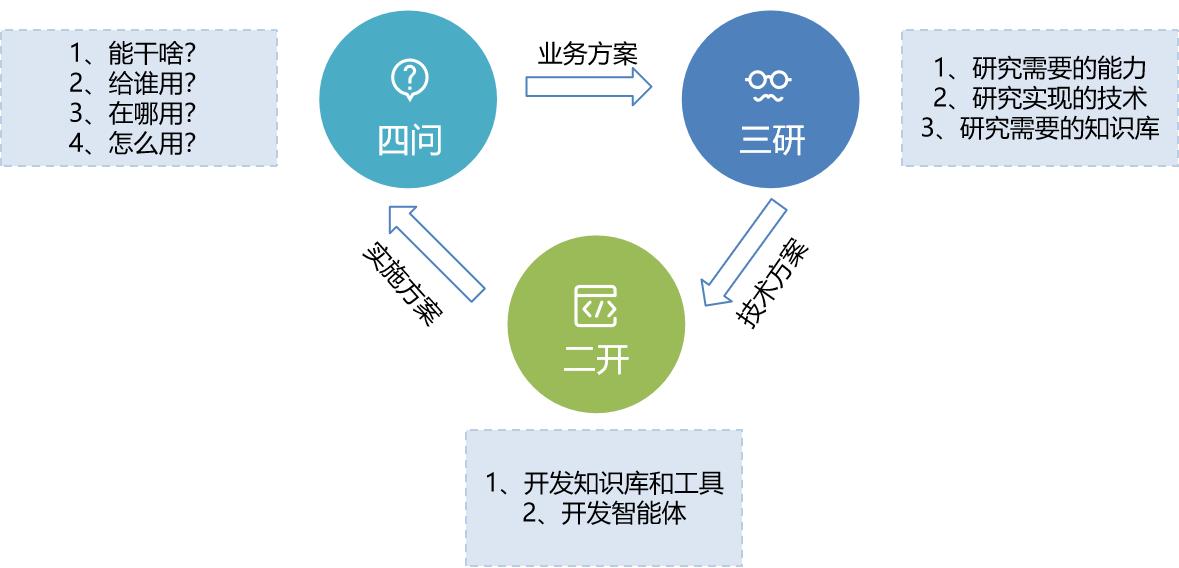 2、三研:研究需要的能力、研究實(shí)現(xiàn)的技術(shù)、研究需要的知識(shí)庫(kù),是智能體“設(shè)計(jì)階段”需要研究的內(nèi)容,主要進(jìn)行智能體開(kāi)發(fā)的可行性分析和實(shí)現(xiàn)路徑設(shè)計(jì),該階段最終輸出技術(shù)方案。