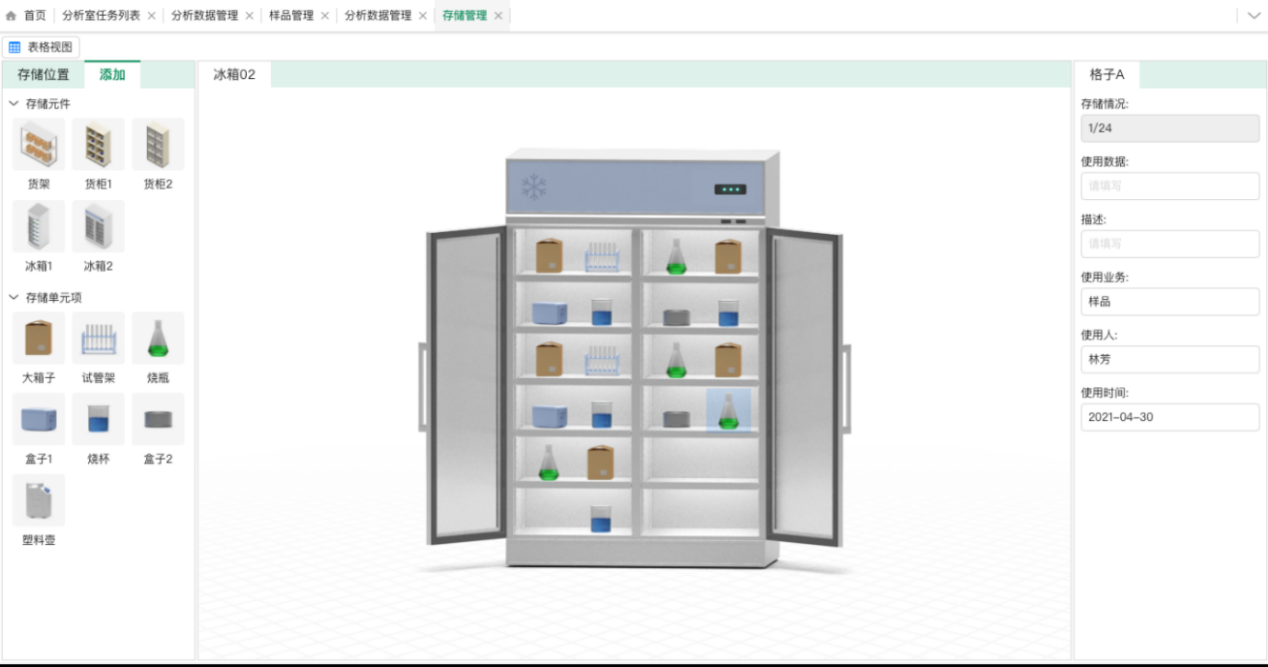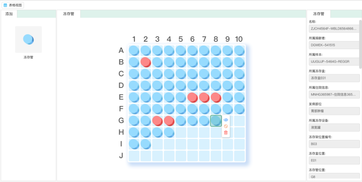 - 生物樣本全程可視,溯源精準(zhǔn)高效:對(duì)生物樣本存儲(chǔ)柜規(guī)格、布板進(jìn)行可視化建模,樣本存儲(chǔ)分布按實(shí)物布局實(shí)現(xiàn)可視化監(jiān)控與精準(zhǔn)追蹤。系統(tǒng)確保每一份樣本信息可快速定位、狀態(tài)清晰可見,為樣本安全和高效利用提供強(qiáng)力保障。