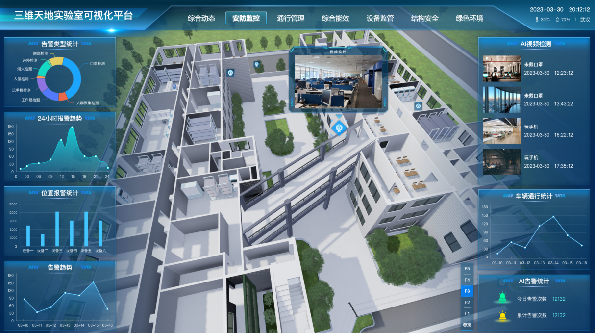 - 智慧安防感知監(jiān)管:智慧孿生平臺(tái)直接獲取門禁出入記錄及視頻監(jiān)控信息。融合計(jì)算機(jī)視覺與前沿AI算法,創(chuàng)新采用“數(shù)字孿生+實(shí)時(shí)視頻”雙通道監(jiān)控模式。系統(tǒng)智能識(shí)別實(shí)驗(yàn)室內(nèi)人員操作行為,對(duì)違規(guī)動(dòng)作(如不規(guī)范操作、危險(xiǎn)行為)進(jìn)行即時(shí)分析與預(yù)警,構(gòu)筑智能化主動(dòng)安全防護(hù)體系。