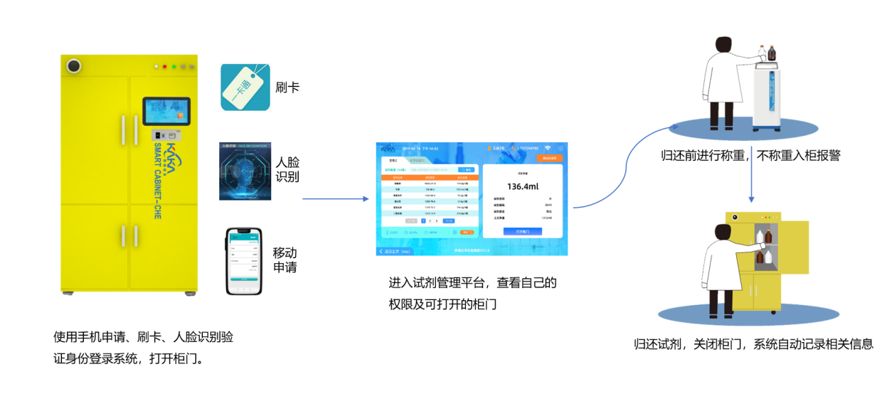 - 危化品智能管控,安全精準(zhǔn)無(wú)憂:創(chuàng)新集成智能試劑柜、RFID標(biāo)簽及人臉識(shí)別技術(shù),構(gòu)建危化品(如易制毒、易爆品)智能安全管理閉環(huán)。系統(tǒng)自動(dòng)校驗(yàn)實(shí)驗(yàn)人員試劑領(lǐng)取權(quán)限,實(shí)時(shí)智能核減庫(kù)存量,并實(shí)現(xiàn)耗材快速定位與自動(dòng)化盤點(diǎn),安全與效率雙提升。