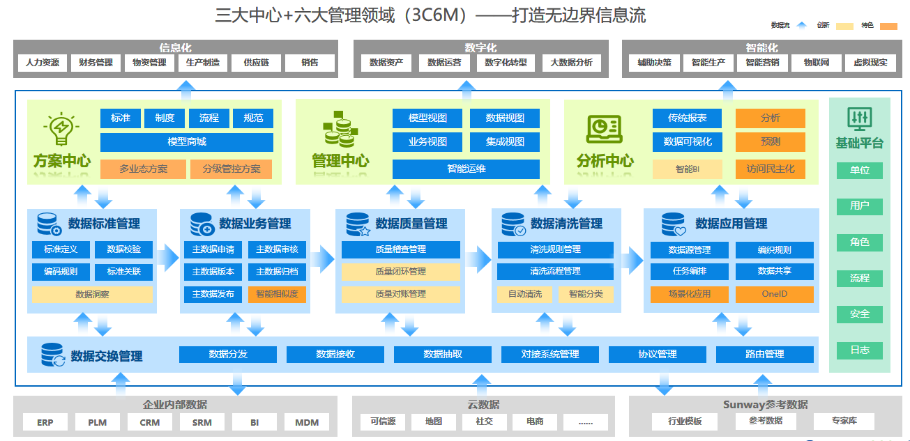 北京三維基于在主數據管理領域深耕細作,整合為眾多特大型央企和集團型企業的項目建設經驗,融合了數據標準管理、數據生命周期管理、數據交換管理、數據質量管理、數據清洗管理、數據應用管理六大模塊,方案中心、分析中心、管理中心三大中心以及Mobile移動辦公,打造3C6M—體化主數據管理解決方案,為客戶提供從標準建立、數據質量管控、數據交換應用、數據治理,到企業數據方案中心建設、數據場景化的深入應用、智能化數據管理、智能化運維等全面的管控、洞察、應用一體化解決方案,為企業數據標準化建設、數據治理提供強大支持,助力企業實現無邊界信息流。
